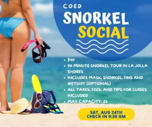 On Saturday August 24th, I’ll be hosting a Coed Snorkel Social with Everyday CA. Join me on this 90 minute excursion in La Jolla Shores to search for leopard sharks. Typically, July- mid September is the best time to see these friendly ocean animals. They come to La Jolla Shores specifically for the warm, shallow water. They hang out just off the coast in search for food and a mate.